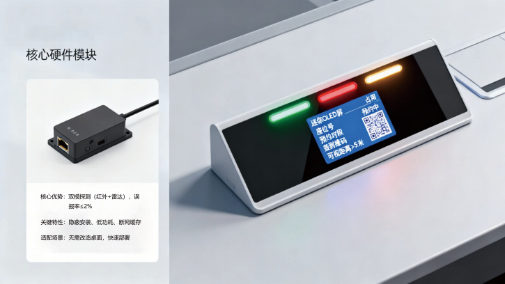 核心硬件采用红外+雷达双模探测,搭配多传感器融合算法,将误报率严格控制在≤2%。该技术可精准识别人体存在状态,彻底规避因物品放置、光影变化灯因素导致的误判,从源头保障座位状态的准确性。同时,硬件设计兼具隐蔽安装、低功耗运行特性,断网时支持本地数据缓存,复网后自动同步云端,极端网络环境下仍能稳定运行。