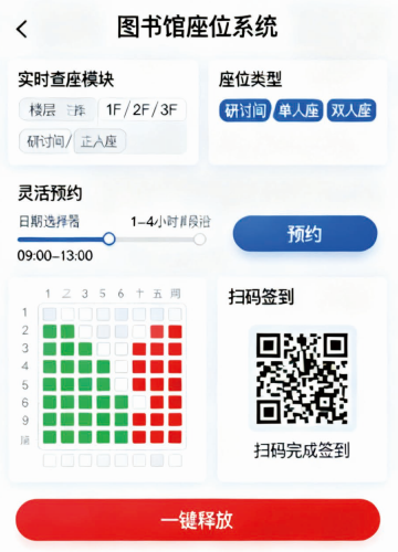 ○ 热力图+防代签:集成实时座位热力图,绿色块代表空闲、红色块代表占用,直观掌握区域座位饱和度;扫码签到时加入位置校验逻辑(需在座位5米范围内完成签到),杜绝远程代签。
